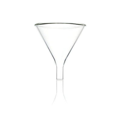 Embudo utilizado para facilitar la transferencia de polvos a un recipiente. Es de tallo corto y ancho, tiene paredes gruesas y uniformes con los bordes moldeados. Resistente al ataque químico y al choque mecánico o térmico. Fabricado en vidrio borosilicato.