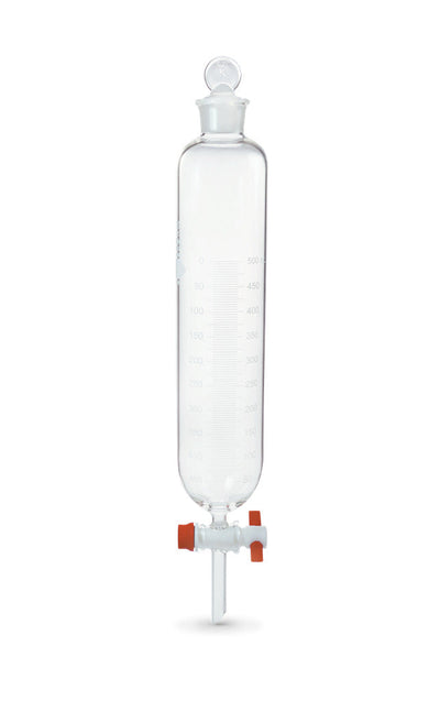 Embudo de separación cilíndrico graduado con llave de PTFE y tapón de vidrio sólido. Utilizado para la separación por decantación de líquidos inmiscibles o insolubles. Diseñado según las especificaciones E1096 de ASTM y fabricado en vidrio borosilicato.