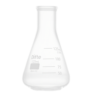 Matraz Erlenmeyer de boca angosta en vidrio de borosilicato. Se utiliza para contener y medir líquidos o sustancias químicas.