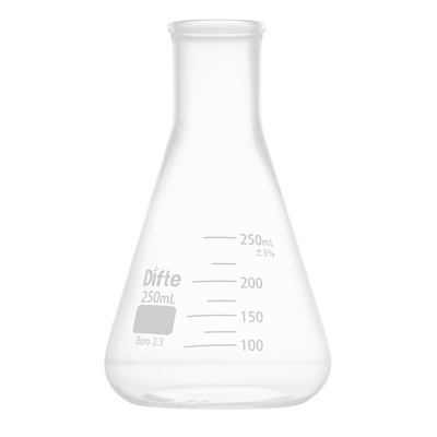 Matraz Erlenmeyer de boca angosta en vidrio de borosilicato. Se utiliza para contener y medir líquidos o sustancias químicas.