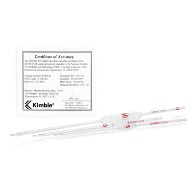 Certificado por lotes de clase A y serializado. Codificado por colores. Las pipetas se suministran con un certificado de precisión vinculado al número de lote impreso en el vidrio. Solo serie 37002: el tamaño de 75 ml está diseñado a partir de ASTM E542. Diseñado y fabricado según los requisitos de ASTM E969. Fabricado con vidrio de borosilicato de expansión 5.1 conforme a los requisitos de USP Tipo I y ASTM E438, Tipo I, Clase B.